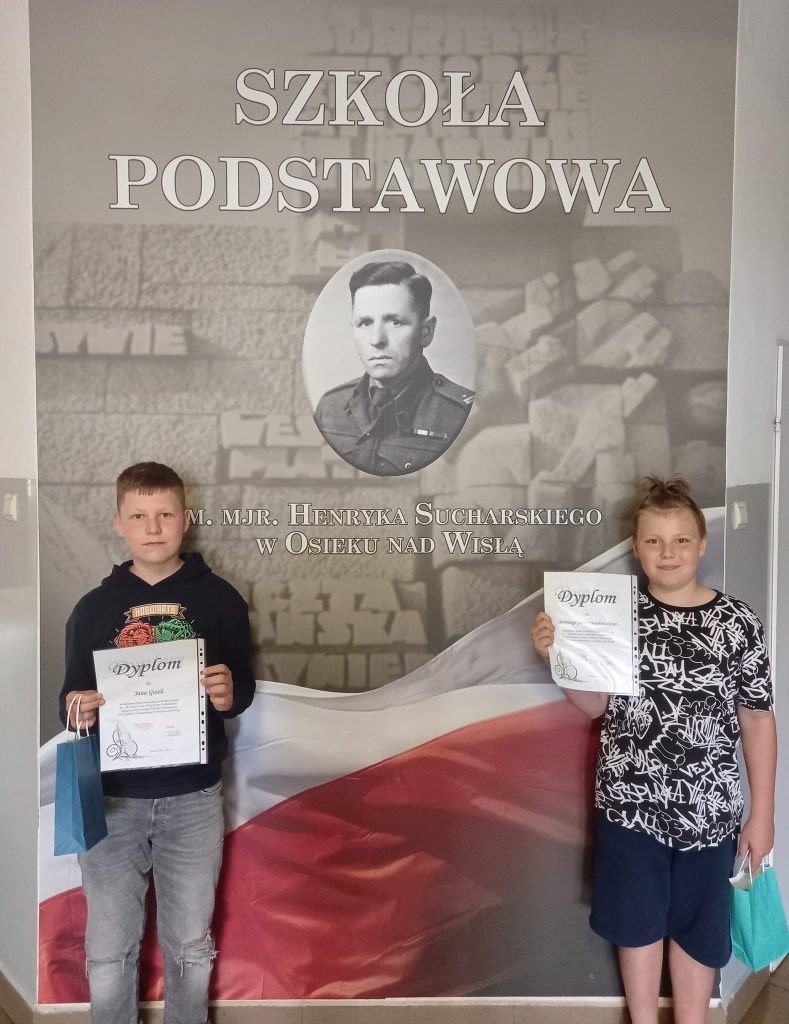 Uczniowie klasy 5 naszej szkoły – Jan Gizela i Antoni Szwajkowski wzięli udział w konkursie historycznym „Wywiad z mjr. Henrykiem Sucharskim” organizowanym przez Szkołę Podstawową im. mjr. Henryka Sucharskiego w Osieku nad Wisłą. Nasi uczniowie znaleźli się w gronie laureatów konkursu i otrzymali nagrody za Najlepsze Prace. Gratulujemy!
