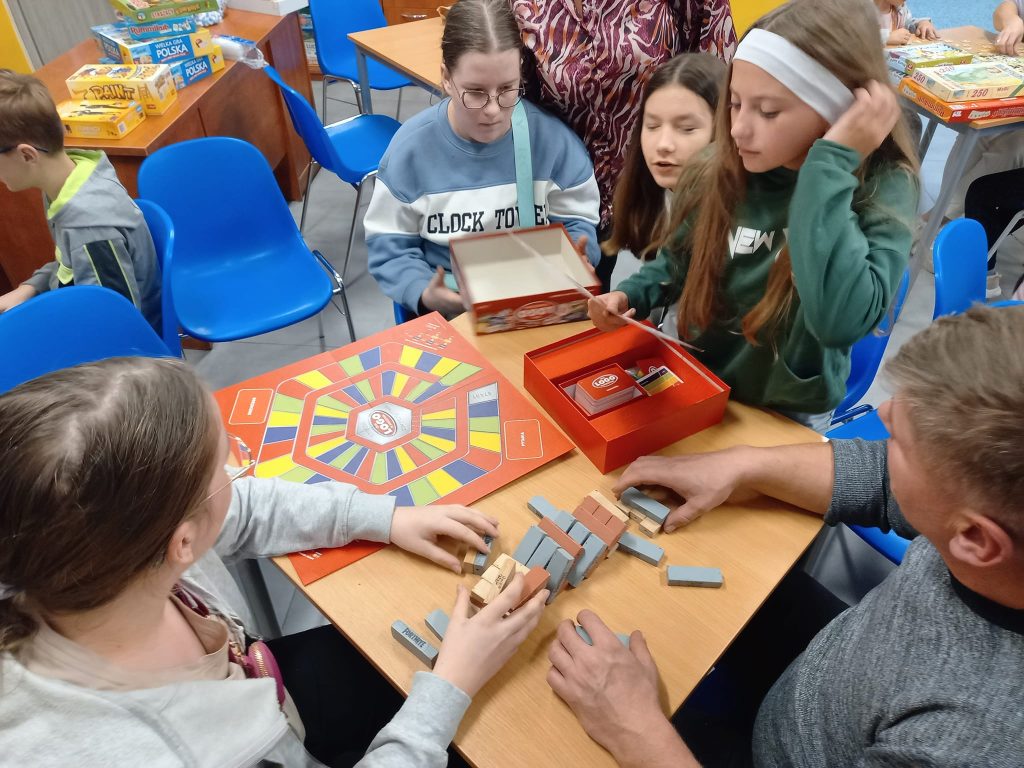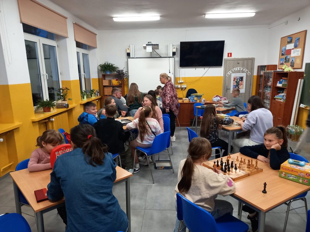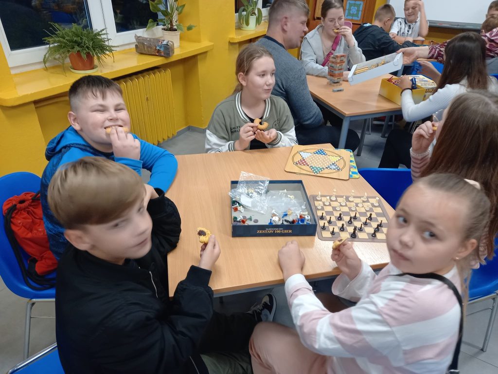 19 października w szkole spotkaliśmy się przy planszówkach. Wieczór Gier Planszowych zorganizowała Rada Rodziców. Przy stołach zasiedli uczniowie, rodzice, nauczyciele i dyrektor. Przy okazji zjedliśmy pizzę ufundowaną przez RR, a świetlica szkolna wzbogaciła się o 3 nowe planszówki również zakupione przez RR. Dziękujemy.