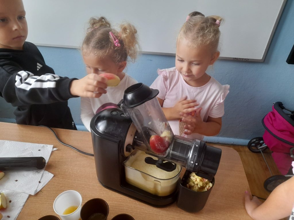 . Dzieci samodzielnie wrzucały jabłuszka do wyciskarki, obserwowały, jak powstaje sok, a potem z dumą degustowały swój zdrowy napój.